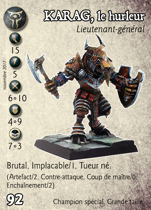 Compétences : Brutal, Implacable/1, Tueur né. (Artefact/2, Contre-attaque, Coup de maître/0, Enchaînement/2).