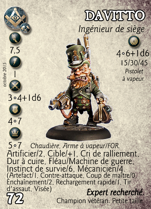 | Compétences : Artificier/2, Cible/+1, Cri de ralliement, Dur à cuire, Fléau/Machine de guerre, Instinct de survie/6, Mécanicien/4. (Artefact/1, Contre-attaque, Coup de maître/0, Enchaînement/2, Rechargement rapide/1, Tir d'assaut, Visée) |