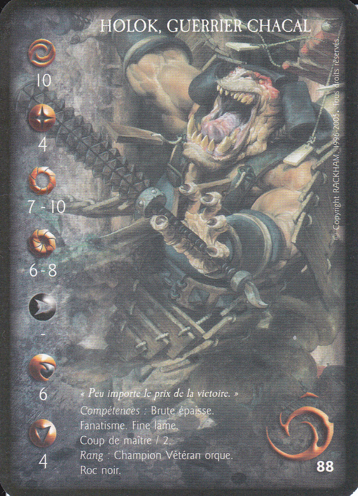 Compétences : Brute épaisse, Coup de maître/2, Fanatisme, Fine lame. (Artefact/1, Contre-attaque, Enchaînement/2).