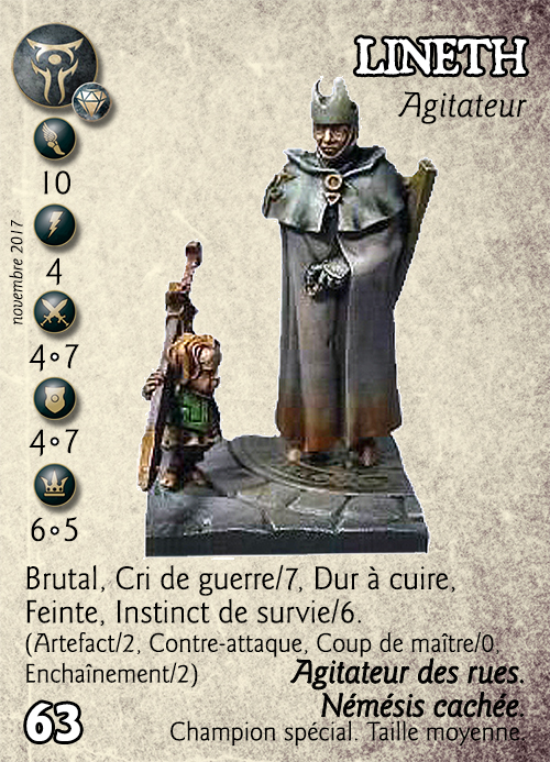 Au début de la phase de Corps-à-corps, avant le choix du premier combat, Lineth peut immédiatement inverser sa position avec celle de tout combattant de la Milice ou de tout garde des orfèvres à 10cm (uniquement si les socles peuvent être manipulés sans bouger d'autre figurine ni rompre de contact). Agitateur des rues. Tout combattant ami de Cadwallon situé à 10cm ou moins d’un agitateur bénéficie des compétences « Cri de guerre/6 » et « Feinte ».