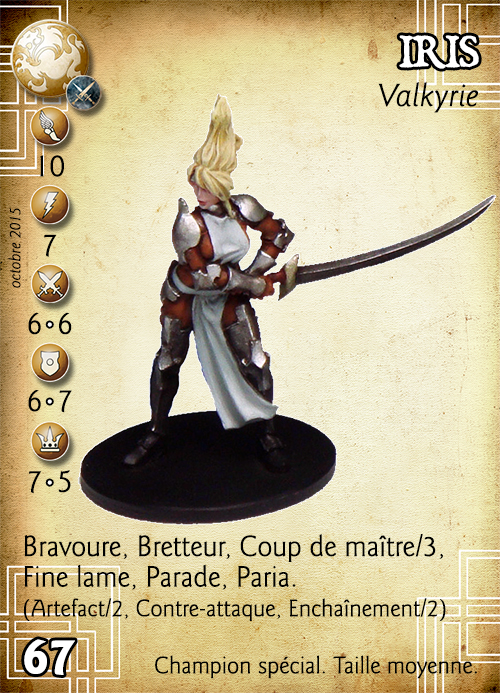 Compétences : Bravoure, Bretteur, Coup de maître/3, Fine lame, Parade, Paria. (Artefact/2, Contre-attaque, Enchaînement/2).
