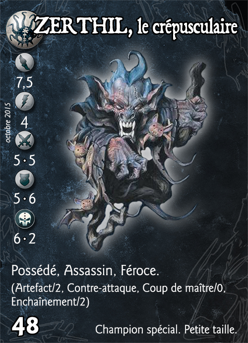 Compétences : Possédé, Assassin, Féroce. (Artefact/2, Contre-attaque, Coup de maître/0, Enchaînement/2).