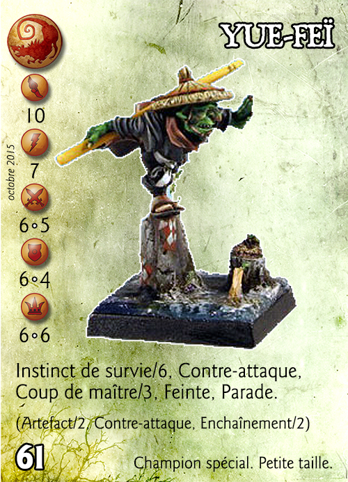 Compétences : Instinct de survie/6, Contre-attaque, Coup de maître/3, Feinte, Parade. (Artefact/2, Contre-attaque, Enchaînement/2).