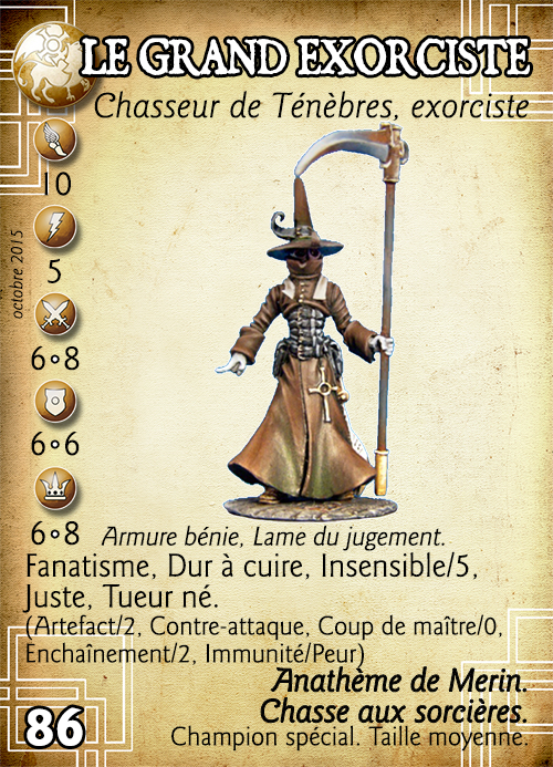 | Capacités : Anathème de Merin. Une fois par tour, lors de l’activation de l’exorciste (avant ou après son déplacement), le joueur qui le contrôle peut désigner un magicien ou un fidèle ami ou ennemi situé à 20cm ou moins de l’exorciste et sur lequel ce dernier dispose d’une ligne de vue.