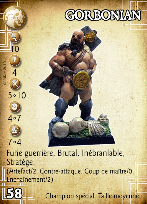 Compétences : Furie guerrière, Brutal, Inébranlable, Stratège. (Artefact/2, Contre-attaque, Coup de maître/0, Enchaînement/2)