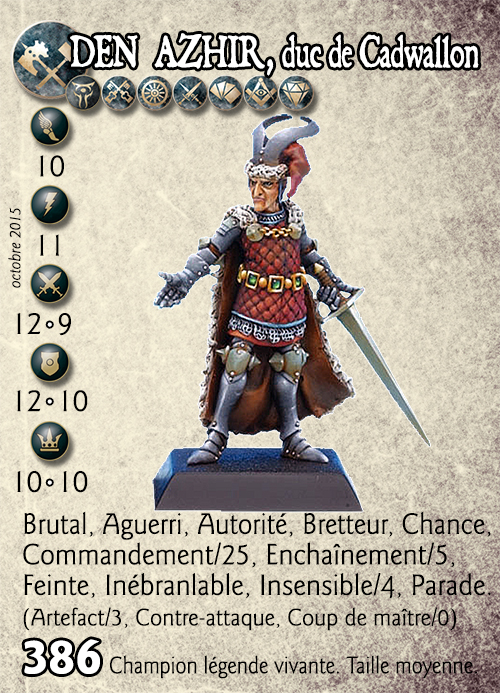 Compétences : Brutal, Aguerri, Autorité, Bretteur, Chance, Commandement/25, Enchaînement/5, Feinte, Inébranlable, Insensible/4, Parade. (Artefact/3, Contre-attaque, Coup de maître/0)
