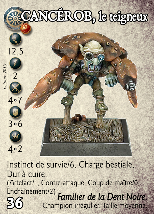 Compétences : Instinct de survie/6, Charge bestiale, Dur à cuire. (Artefact/1, Contre-attaque, Coup de maître/0, Enchaînement/2)